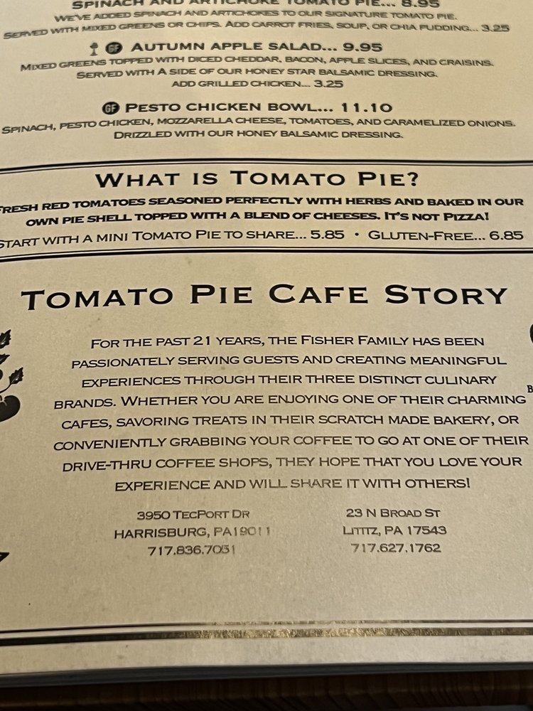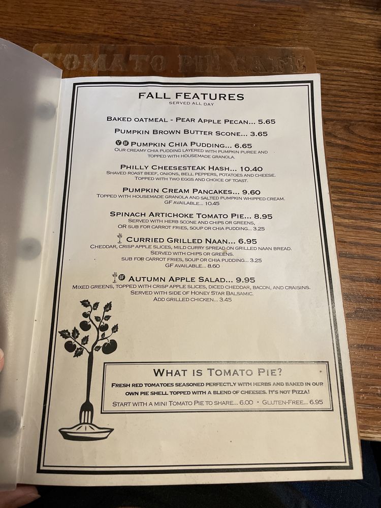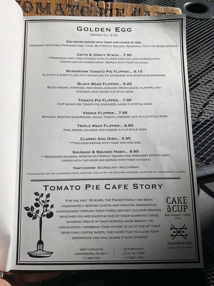 Welcome to Tomato Pie Cafe, a delightful haven for breakfast and brunch lovers located at 23 N Broad St, Lititz, PA. This charming spot offers a menu brimming with a variety of scrumptious choices. Highlights include the savory Tomato Pie, which even tomato skeptics rave about, thanks to its exceptional seasoning. Complement your meal with a Chocolate Espresso Scone or the Cherry Almond Baked Oatmeal, ideal for starting your day on a sweet note.